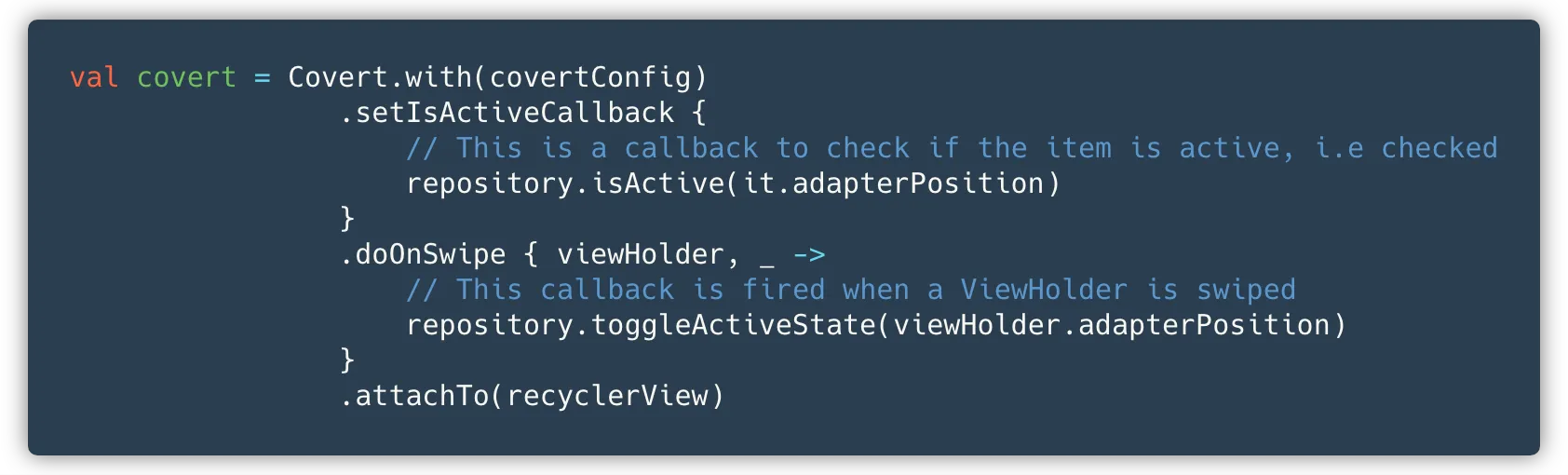 With your config set up, you can now build Covert and apply it to your RecyclerView.