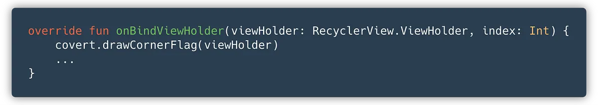 Finally, pass through your Covert instance to your adapter to draw corner flags on your ViewHolders. This is used when initially binding the ViewHolder, to show flags on items which are initially checked.
