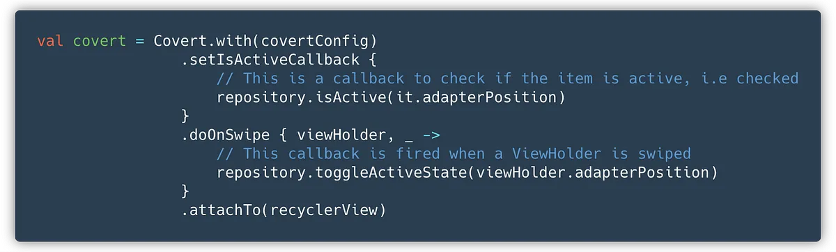Applying Covert to your RecyclerView takes just a few lines. Here’s an example of applying Covert to make the interaction shown above.